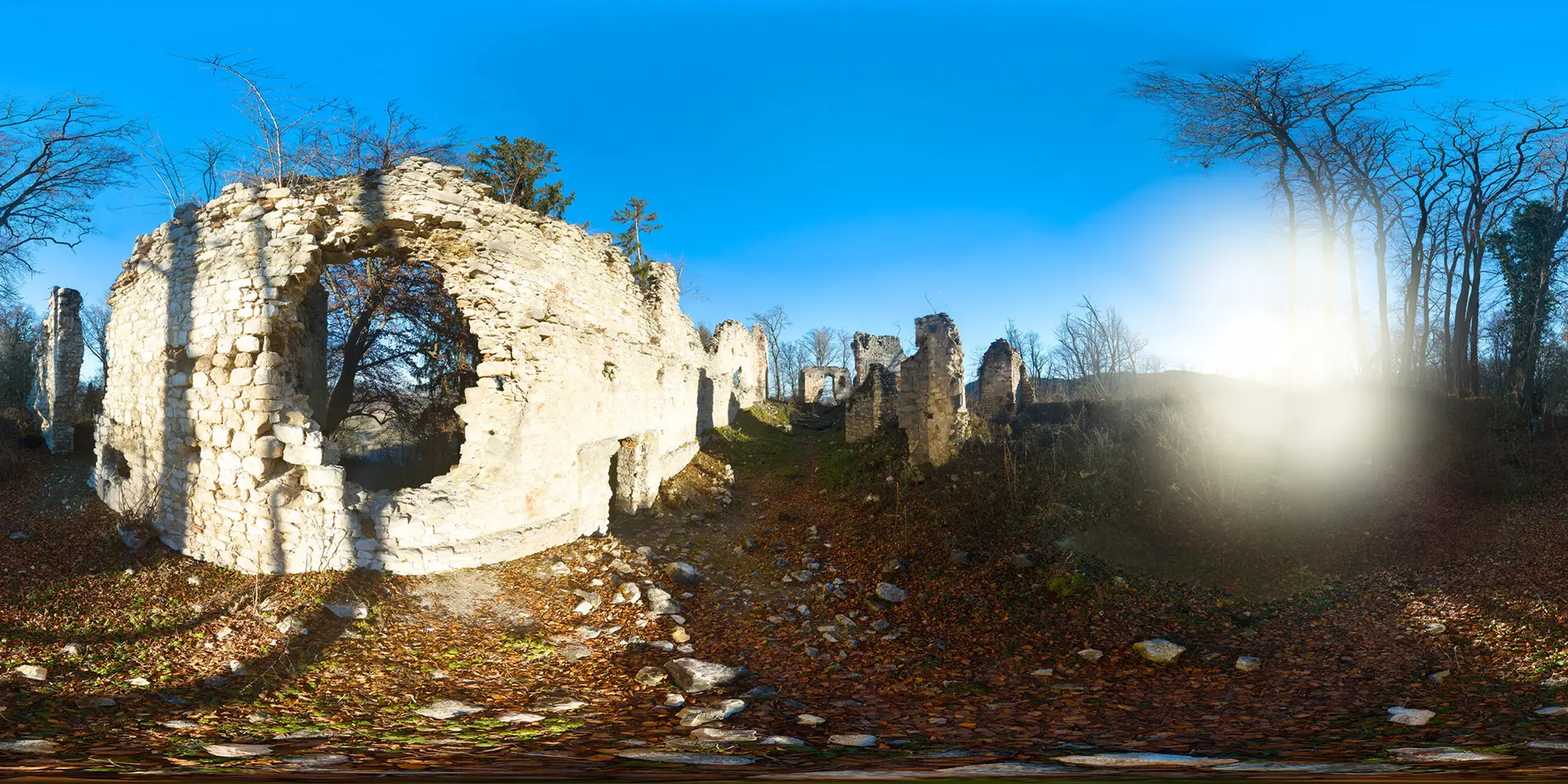 Virtuelle 360°-Panorama-Tour (Monitor oder VR-Brille) durch die Burg-Ruine Wildon in der Steiermark. Eigentlich sind es zwei Burgen-Ruinen.