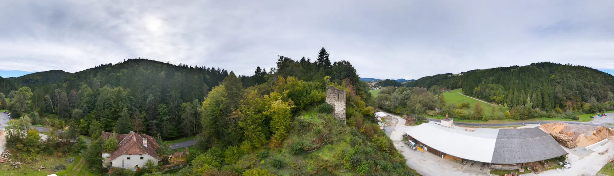 Virtuelle 360°-Panorama-Tour durch die letzten Reste der Burgruine Raabeck bei Weiz in der Steiermark. Geeignet für PC, Tablet und VR-Brille (z.B. Quest 3).