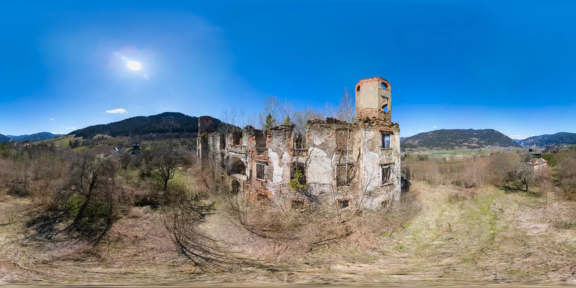 Virtuelle 360°-Tour durch die Schloss-Ruine Schrattenberg bei Scheifling in der Steiermark (AT). Die Tour umfasst das Oben, Außen und Innen.